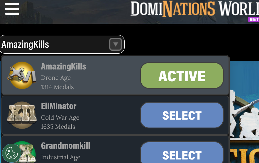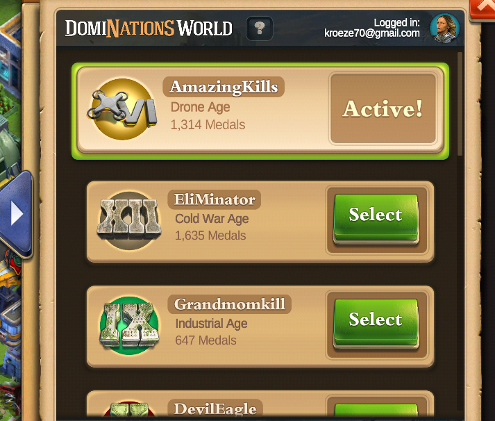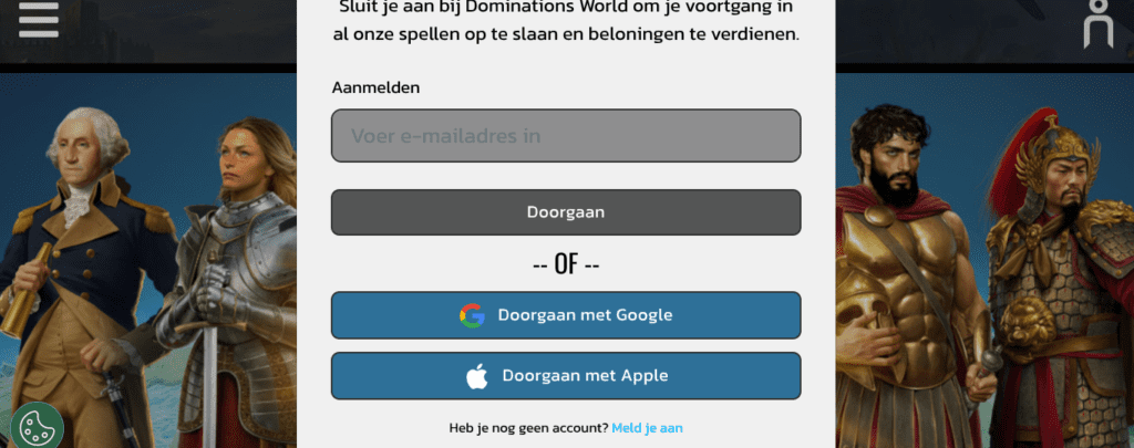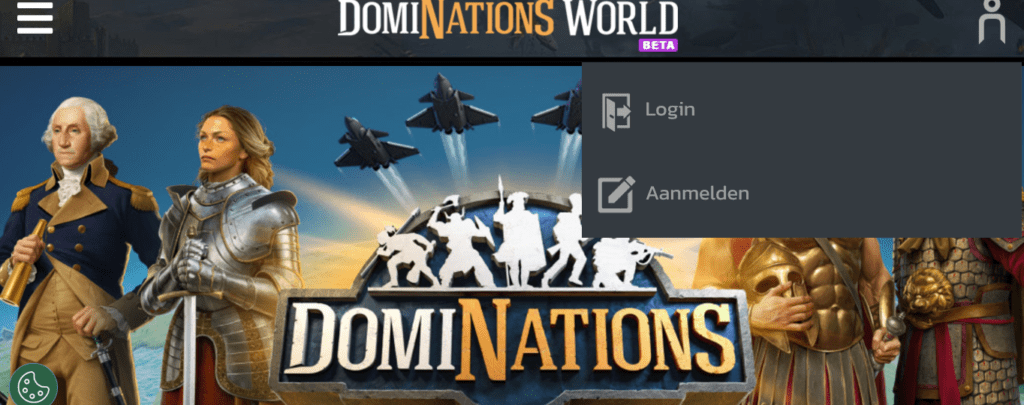 Je ziet dan bovenaan staan Dominations World, klik daar op en je surft dan naar de website Dominationsworld. Dan zie je dat je rechtsbovenaan kan inloggen met je account die je hebt gemaak met je eerste account.