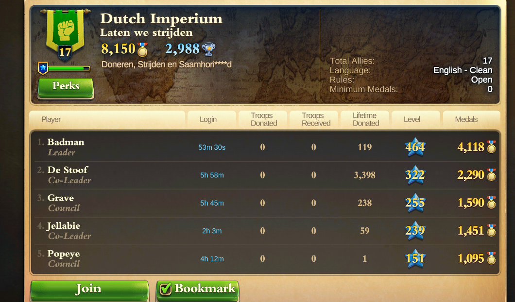 De Leader van deze geweldige Nederlandse Alliantie is Adrie (spelersnaam Badman level 464)