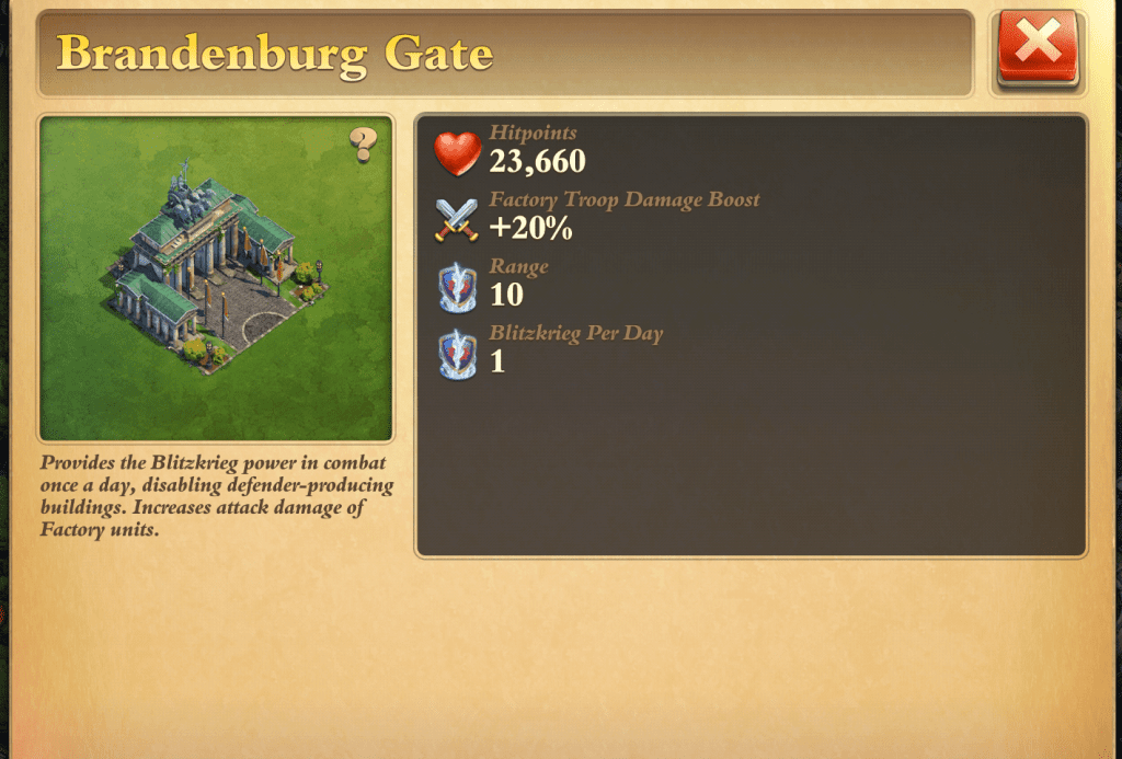 Het wonder de Brandenburg Gate geeft je Factory troepen, dus bazooka, mrl, commando etc 20% meer damage boost, plek waar die staat maakt niet uit. En 1x per dag krijg je gratis een Blitzkrieg die extra power aan je troepen geeft voor een paar seconden, handig als bijvoorbeeld net de HQ binnen de 5 sterren victory tijd plat wil hebben.