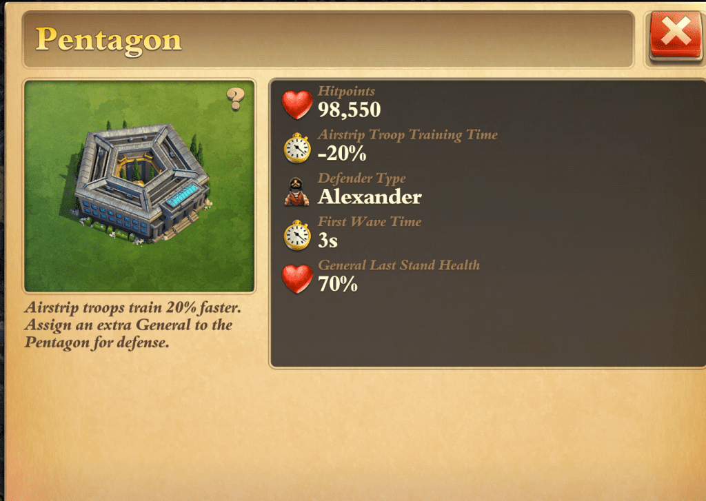 Het wonder Pentagon is goed voor een 4de generaal, ideaal als je je generaals al op hoog niveau hebt, bijvoorbeeld op level 100, dan komen er 4 dikke generaals op je af ipv 3. ook worden je bomers etc 20% sneller getraind voor de 2de ronde:) Al is dit niet geheel meer van belang na de nieuwste update.