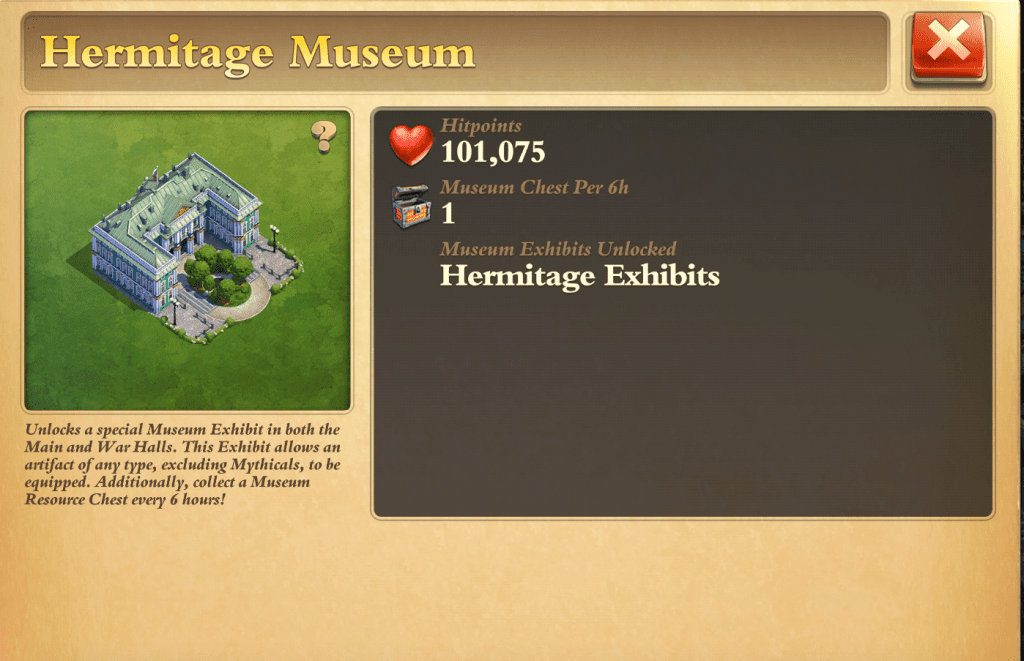 🏛️ Hetzelfde idee doe je in je museum met artifacten, daar zet je dus ook artifacten in die je verdediging sterker maken in percentage, bazooka, mrl, bommenwerpers in % verhogen.