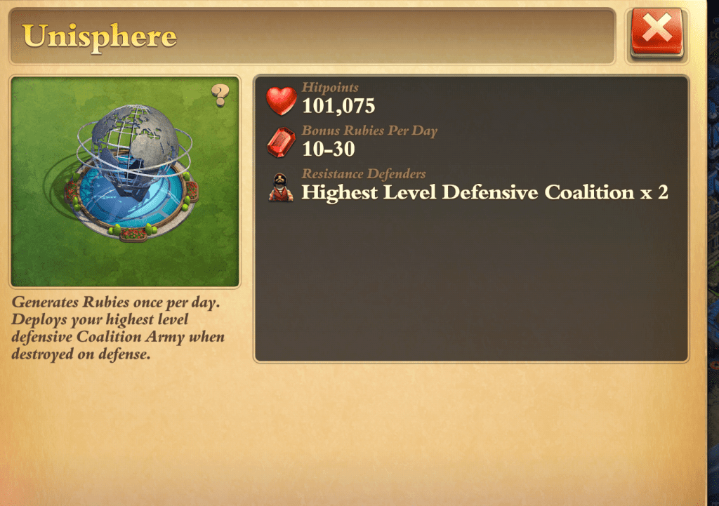 Het wonder Unisphere geeft je elke dag rode robijnen, daarmee kan je in Marco polo grondstofgfen kopen die je nodig bent ben om je Coalitions te activeren in de war en je kan er ook Speedup kisten, troepen kisten, blessing kistyen mee kopen. Als dit wonder wordt vernietigd dan zal je sterkste defence Coalitions je basis gaan verdedigen.