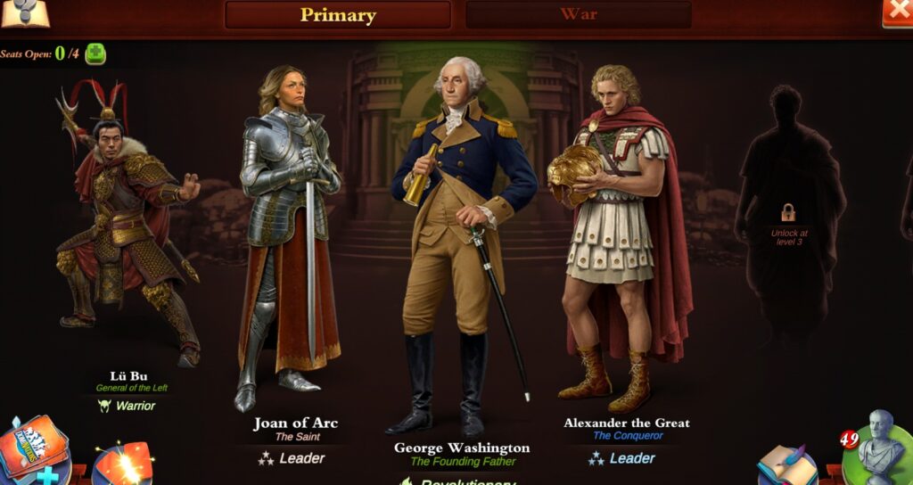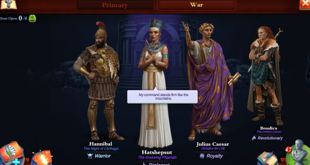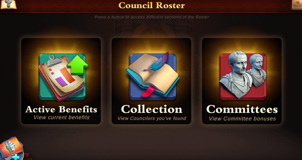 De kernfunctie van de Raad is het toewijzen van adviseurs aan de beschikbare zetels. Elke adviseur heeft unieke vaardigheden die uw natie versterken. Deze adviseurs komen in verschillende zeldzaamheden, van “Common” (grijs) tot “Legendary” (oranje). Hoe zeldzamer de adviseur, des te krachtiger en talrijker zijn de bonussen.