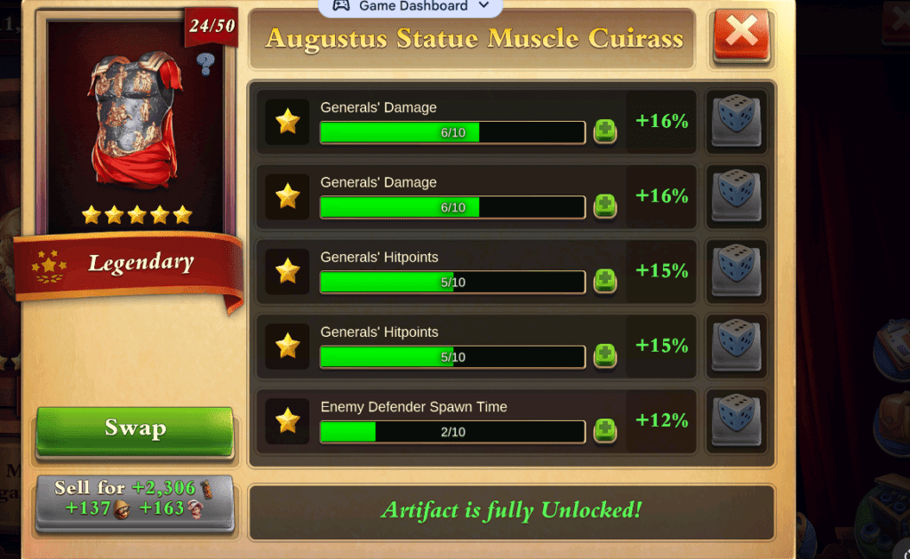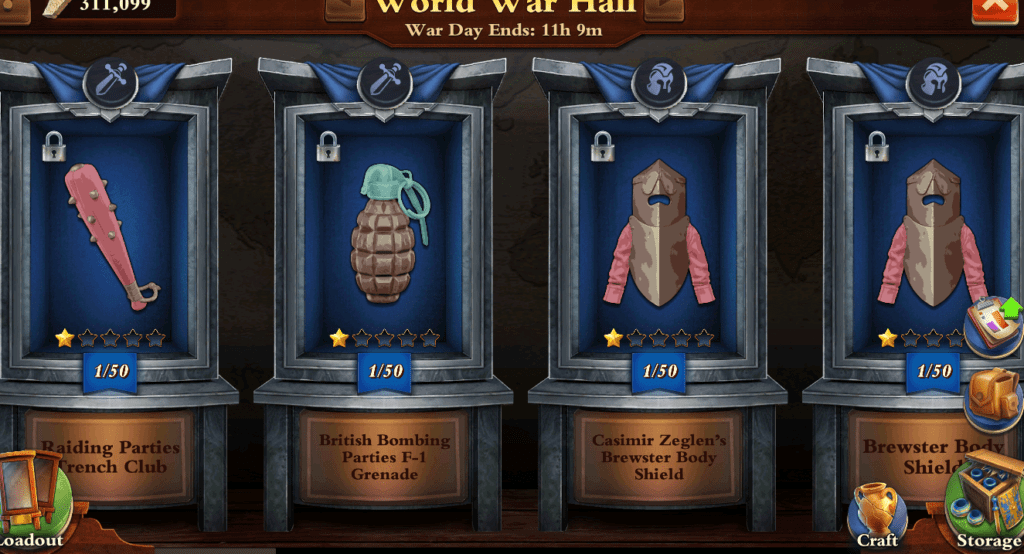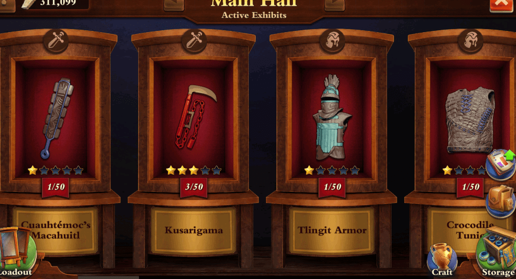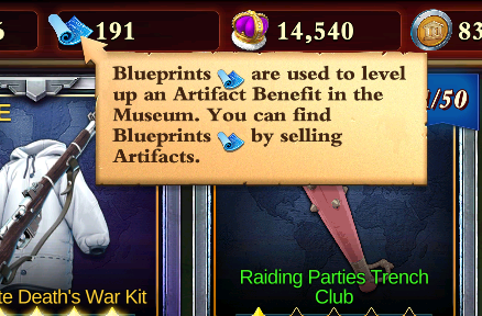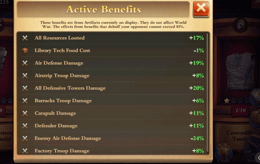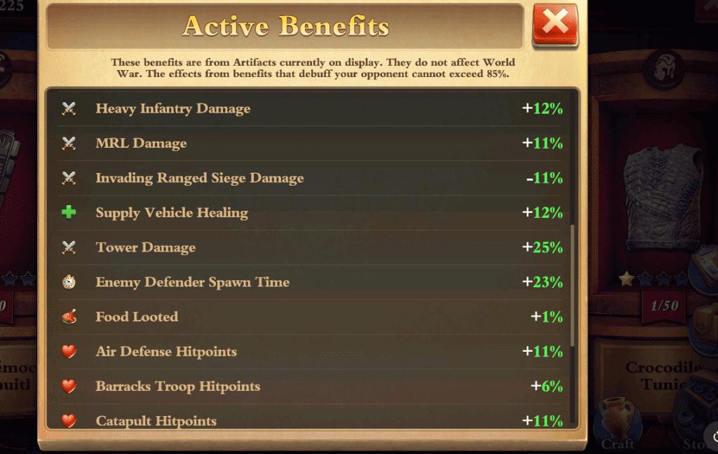 Hierboven op de afbeelding zie je de Artifacts die geactiveerd zijn in je museum, dit is de main hal, dat betekent je doorgaande spel die je speelt. Dus niet de WAR artifacts. Deze helpen je alleen in je doorgaande spel.
