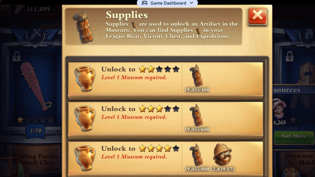 Hierboven zie je het aantal Supplies, met Supplies en Researchers kan je een Artifact verder unlocken. Wordt later behandeld. Researchers zie je hierboven ook, man met snor en helm op:) Die unlock de 4 regel van je Artifact.