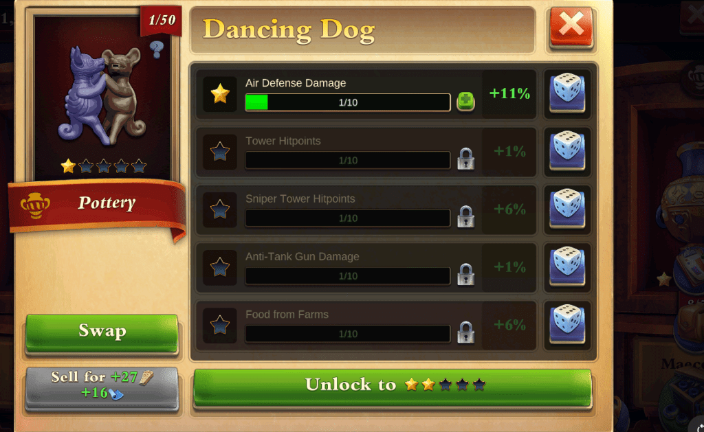 Daar staat Air defence damage 11%, dat betekend dus dat mijn airdefence met 11% versterkt wordt door die ene regel. Je kan de andere regels eronder unlocken met Supplies wat ik je eerder heb laten zien wat dat waren.
