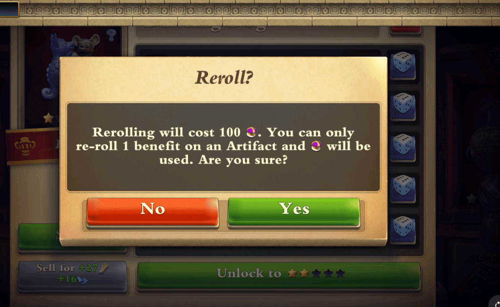 Als een regel in je artifact je niet aanstaat dan kan je een rerol doen, er staat achter elke regel een dobbelsteen. Als je daar op klikt dan verander je de regel voor wat anders. Maar je weet niet wat er gaat komen! En het kost 100 kronen per rerol!